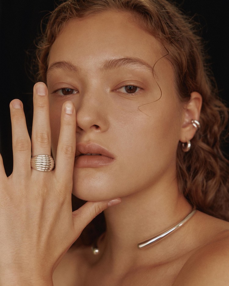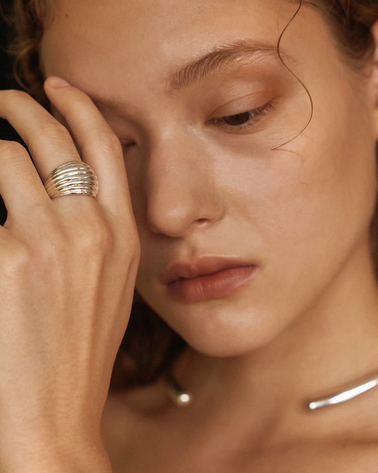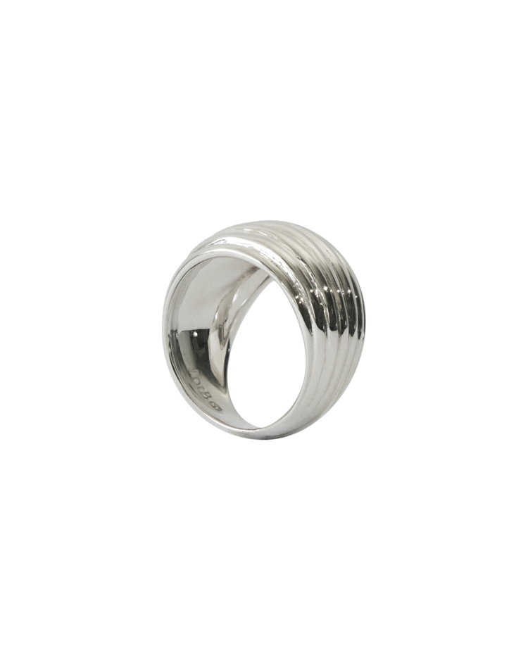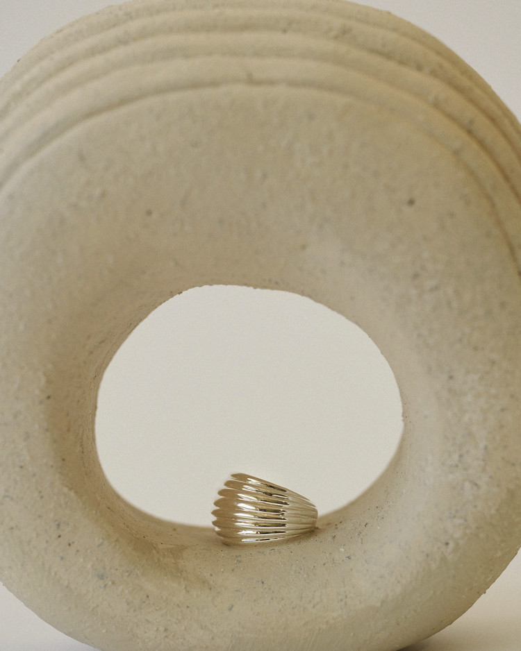 잘 익은 열매와 같은 통통하고 우아한 곡선의 중첩으로 꽉, 차는 사랑을 모티프로 제작되어 볼륨감과 함께 - 중세 건축 양식과 같이 조화와 볼륨의 균형적 미감을 담아 간직된 듯한 Full of Love 의 시그니처 링 디자인. 안 쪽면에 브랜드 로고가 새겨져 있으며, 정은(스털링 실버)로 제작.