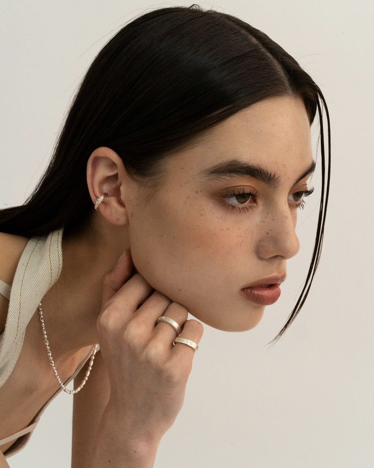 이어커프 바디를 감싸는 얇은 3개의 라인이 조형적으로 배치된 디자인의 이어커프입니다. 귓바퀴를 타고 내려 흐르듯 내려 쉽게 착용이 가능하며, 미니멀하고 정제된 미감의 베이직 라인으로 약간의 조형성이 더해진 이어커프입니다. 아주 적당한 크기와 무게감으로 쉽게 빠지지 않으면서도, 착용한듯 안한듯 - 편안한 착용감을 지니고 있어 데일리한 연출하기에 무척 매력적입니다. 실버 바디의 안 쪽에 브랜드 로고가 새겨져 있으며, 모든 부분 정은으로 제작되었습니다. 주문 후 2~7일의 제작기간이 소요됩니다.