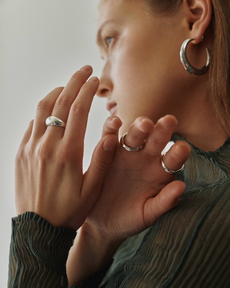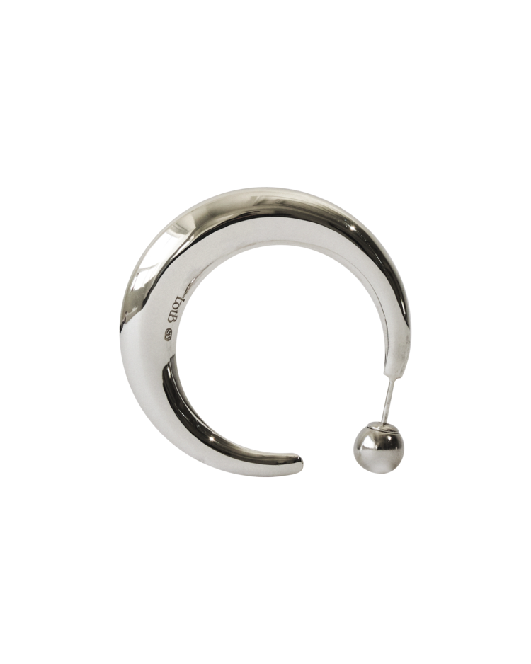얇게 비친 초승달의 형태와 같은 쉐입으로 볼드하면서도 스케일이 큰 후프 형식의 이어링. 형태의 속을 비우면서도 볼륨을 살려 가벼운 착용감과 우아함을 지닌 디자인. 하나의 착용만으로도 존재감을 드러냄. 옆면에 브랜드 로고가 새겨져 있으며, 정은(스털링 실버)로 제작.