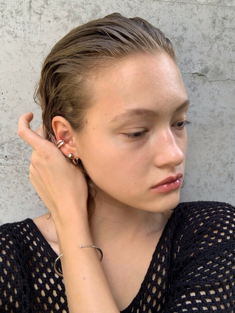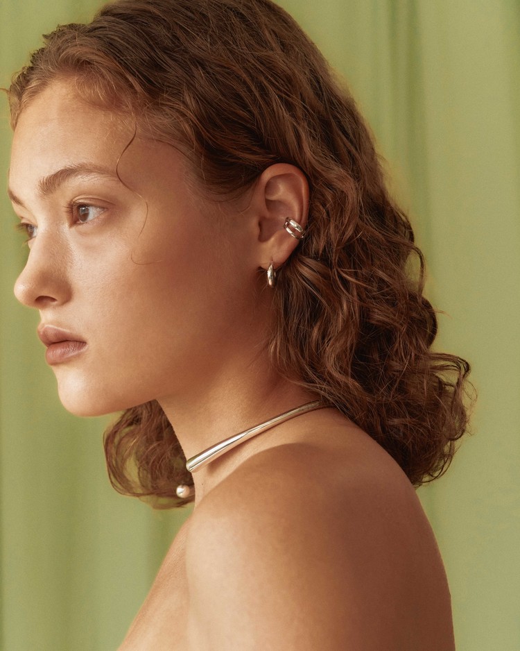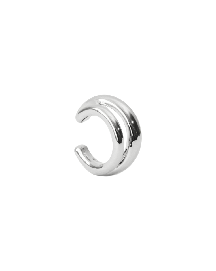 형태의 곡선감이 오버밸런싱으로 디자인되어 귓바퀴를 따라 착용되는 옆면의 형태적 곡선이 무척 아름다운 이어커프. 윗면에 브랜드 로고가 새겨져 있으며, 정은(스털링 실버)로 제작.
