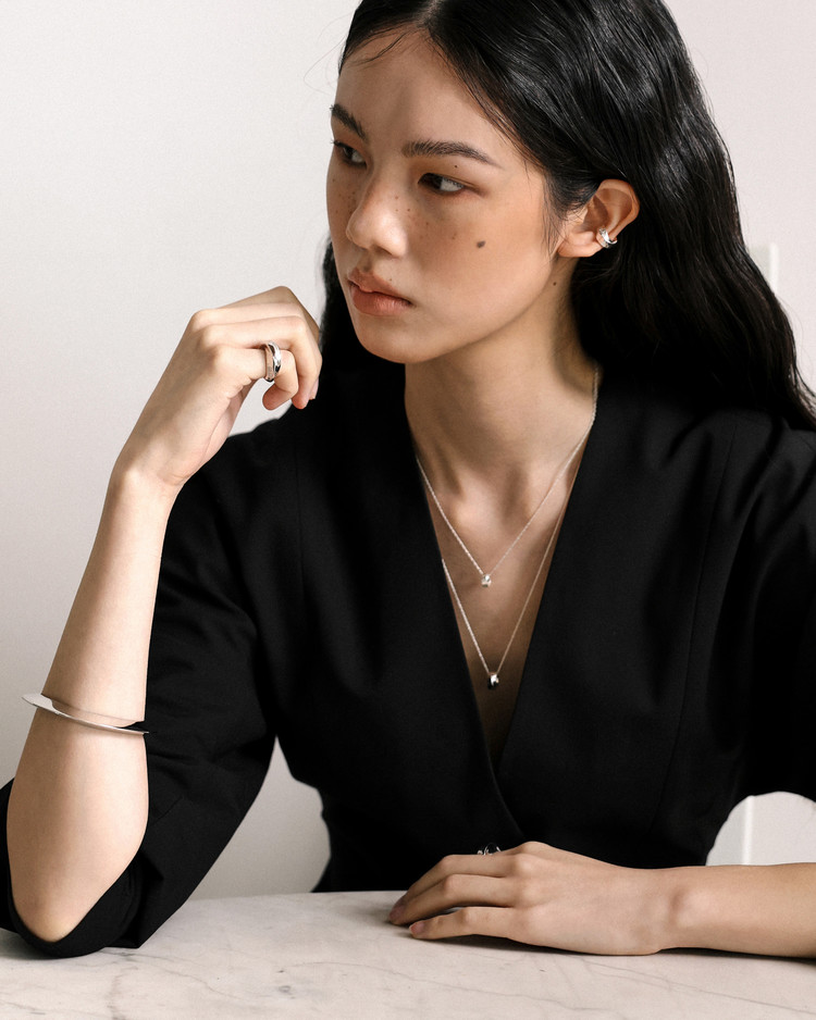 뱅글은 손과 손목사이즈를 고려하여 2가지 사이즈로 제작되었습니다. 모델의 경우 자켓 위 착용한 경우 1 SIZE, 손목 바로 아래 스킨에 딱 맞게 착용한 경우 0 SIZE를 착용하였습니다. 제작 이후 사이즈 변경이 어려운 제품으로 내부 직경을 확인 후 사이즈를 선택해주세요.